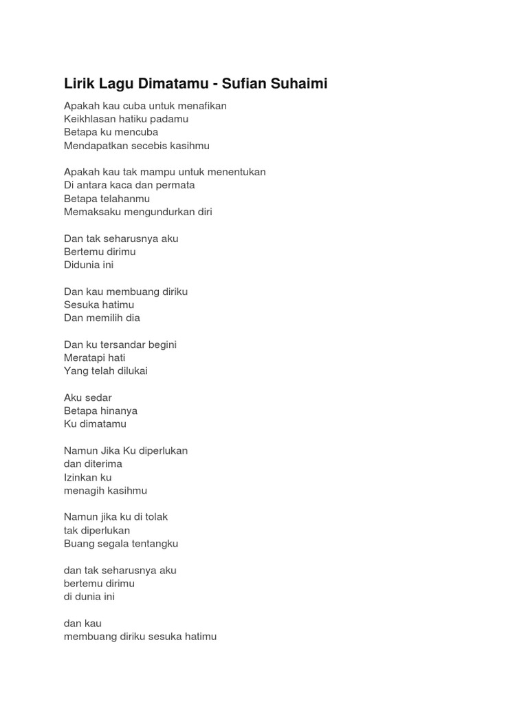 Lirik Lagu Mencuba dari Sufian Suhaimi. Lirik Lagu Di Matamu Sufian Suhaimi. Difikiranku hanya ada engkau Maafkan hati yang menitip jalan kepadanya Telah ku teruskan semuanya.